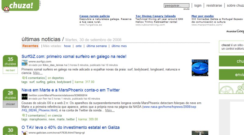 Estes días estamos na portada da web da maior rede social galega en Internet, Chuza.org. Chuza! é un sitio de novas galegas que emprega un control editorial non xerárquico. Calquera pode enviar historias e a comunidade de internautas é quen as valora, as comenta e decide se publicalas na páxina principal, de forma que non intervén nunca a figura do editor. Esta rede ten máis de 3.000 usuarios e 4.000 visitas diarias.