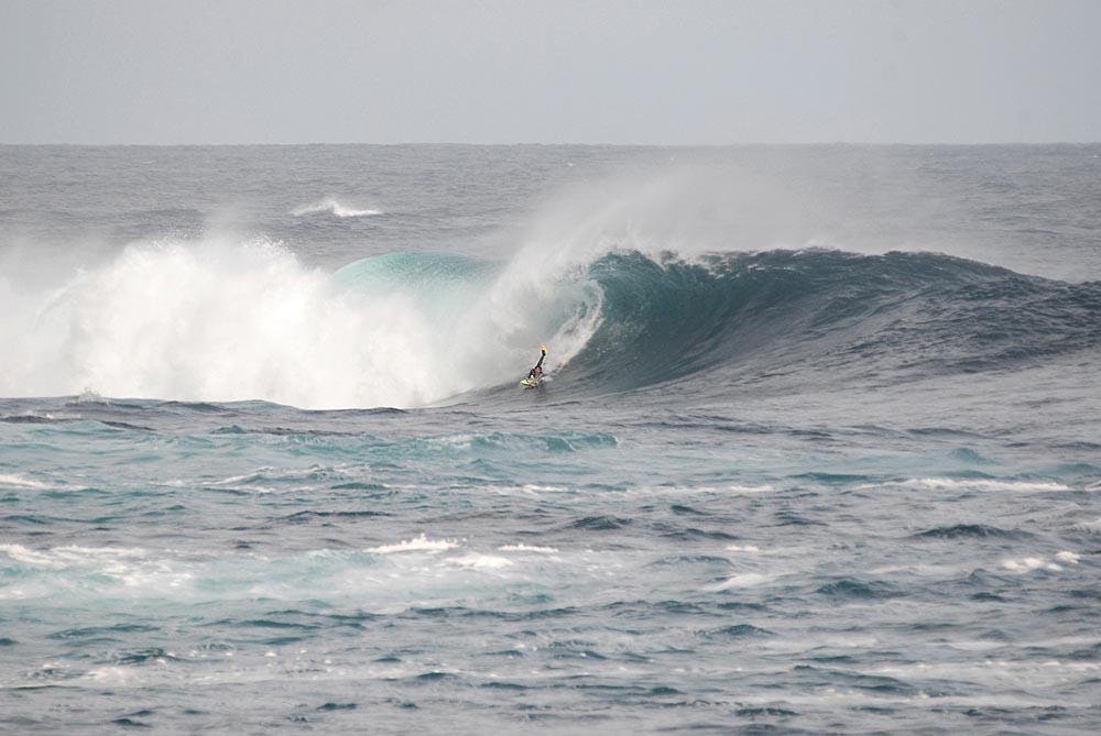 Unha vista de lonxe da onda con Christian no tubo e marea chea
