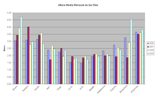 Hoxe publicamos unha información publicada no blog de Bodyboard Galego sobre a altura das ondas nas Rías Baixas dende xaneiro do 2006 ata decembro do 2009. Esta análise está feita cos datos das boias en alta mar e da os resultados do promedio semanal de altura, o promedio mensual de altura, comparando ano a ano e o promedio mensual de altura agregando os catro anos do estudo.