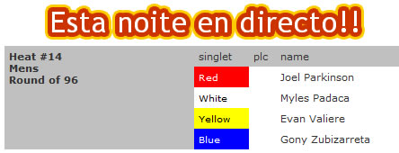 Actualizado! Aínda podedes conectarvos en directo con Hawaii e mirar a manga de Gony. Esta vai dura de roer xa que Gony ten diante ao mítico hawaiiano Myles Padaca, ao monstruo do surf xa recuperado da súa lesíón no nocello Joel Parkinson e a outro hawaiiano chamado Evan Valiere. Boa sorte Gony!