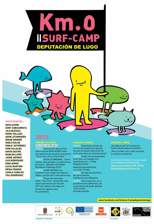 Xa está en marcha o Surfcamp Km.0 2012 na Mariña coa participación de surfeiros destacados do panorama estatal como Kepa Acero, Gony Zubizarreta, Hodei Collazo, Pablo Solar, Pablo Gutiérrez, Luís Rodríguez, Jaji Iglesias, Yoli Rodríguez, Erika Franco, Lucía Martiño, Marlon Lipke, David Sastre e outros destacados riders que van surfear as mellores ondas da Mariña de novo.
