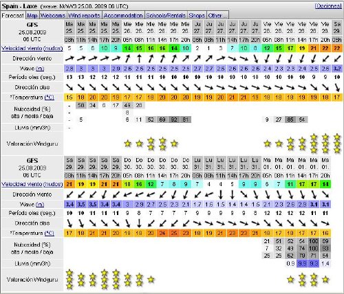 Como podedes comprobar na imaxe a continuación, as previsións son de ventos "onshore" de 21 nós e ondas de 3 metros e medio, o que fai prever que a práctica do surf será prácticamente imposible e perigosa, especialmente para as categorías Xunior e Infantil.