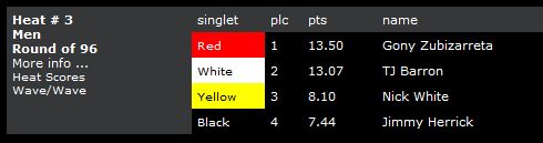 Gony Zubizarreta pasou a súa manga na primeira posición con 13.50 puntos por diante de TJ Barron, Nick White e Jimmy  Herrick. Agora vai loitar na auga co hawaiiano Tony Meister, o basco Hodei Collazo e o yanqui Nathan Yeomans para continuar na competición de auga fría.