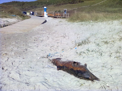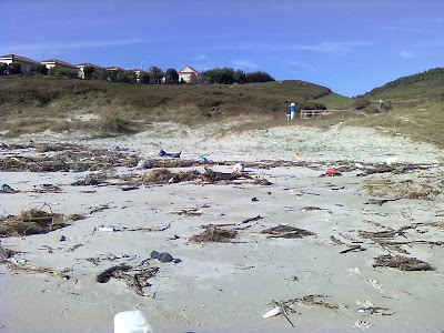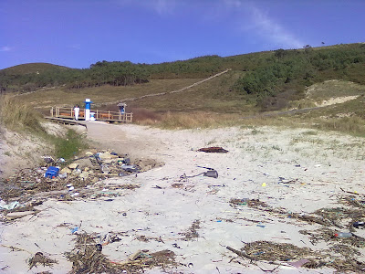 Este é o texto da nova no blog dos Tombos: "Asi é como se encontra Nemiña hoxe mesmo. E como Nemiña moitas míis pois o mar de fondo e os temporais que houbo este inverno deixaron moita basura e rastroxos en todalas praias da zona. Quen puidera limpalas todas pero facemolo en Nemiña por ser a praia de referencia no surf da zona pois o de limpalas todas correspondelle a outras persoas,nos so aportamos un pequeno gran de area,unha protesta pacifica polo malestar que sentimos en chegar a un paraiso e encontralo asi.