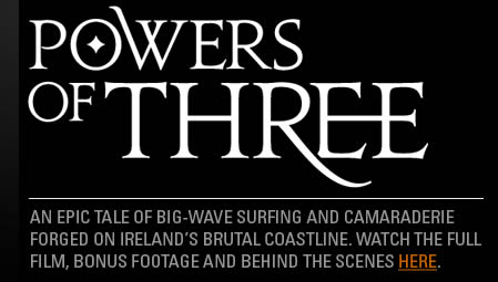Eiquí tedes o video enteiro de "Powers of Three" filmado nas augas de Irlanda. Este video dura 35 minutos e nel aparecen tres surfeiros Tom Lowe, Fergal Smith e Mickey Smith surfando as ondas máis poderosas desta terra irmá.