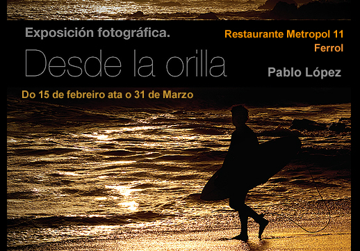 Xa esta inaugurada a exposición fotografica de Pablo Lopez Hernandez, colaborador da nosa web, de fotos relacionadas co mundo do surf. Podedes pasar pola expo no restaurante-cafetería, Metropol 11, na cidade de Ferrol, na estrada de Castilla nº11, do 15 de febreiro ao 31 de marzo.